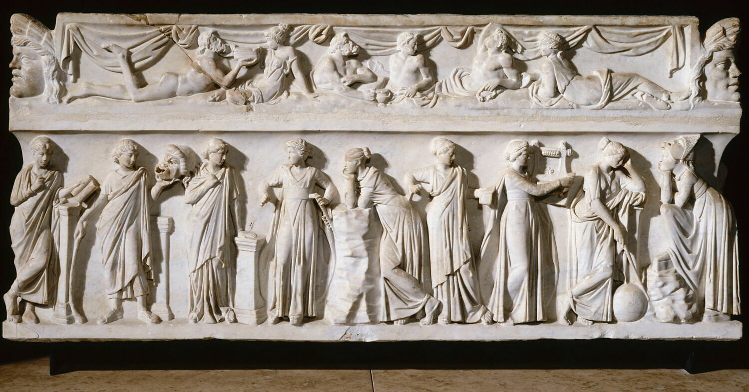 The image above shows the front panel of the “Muses Sarcophagus,” depicting the nine Muses and their attributes. Find out more about it here.